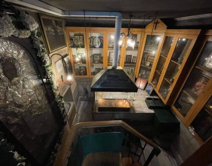 Για να βρείτε το αγίασμα πρέπει να περάσετε από την βοηθητική είσοδο του καταστήματος, στο υπέρθυρο της οποίας υπάρχει η επιγραφή AYAZMA.